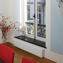 - Schallentkoppelte Lüftereinheit auf die Länge des Wärmepumpenheizkörpers optimiert (25 % leiser gegenüber herkömmlichen Gebläsekonvektoren mit Radiallüfter)